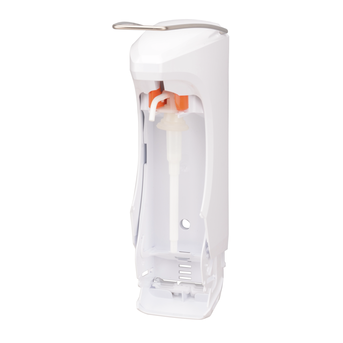 RX 5 M manueller Spender für Desinfektionsmittel, Alcogel, Seifen und fließfähige Lotionen, für Wandmontage, für 500 ml Standard-Euroflaschen, Kunststoff-Gehäuse weiß, Edelstahl-Bedienhebel, austauschbare Kunststoffpumpe, Dosiermenge 1,5 ml/Hub, inkl. PET-Leerflasche, Spender abschließbar, mit weißer Abtropfschale